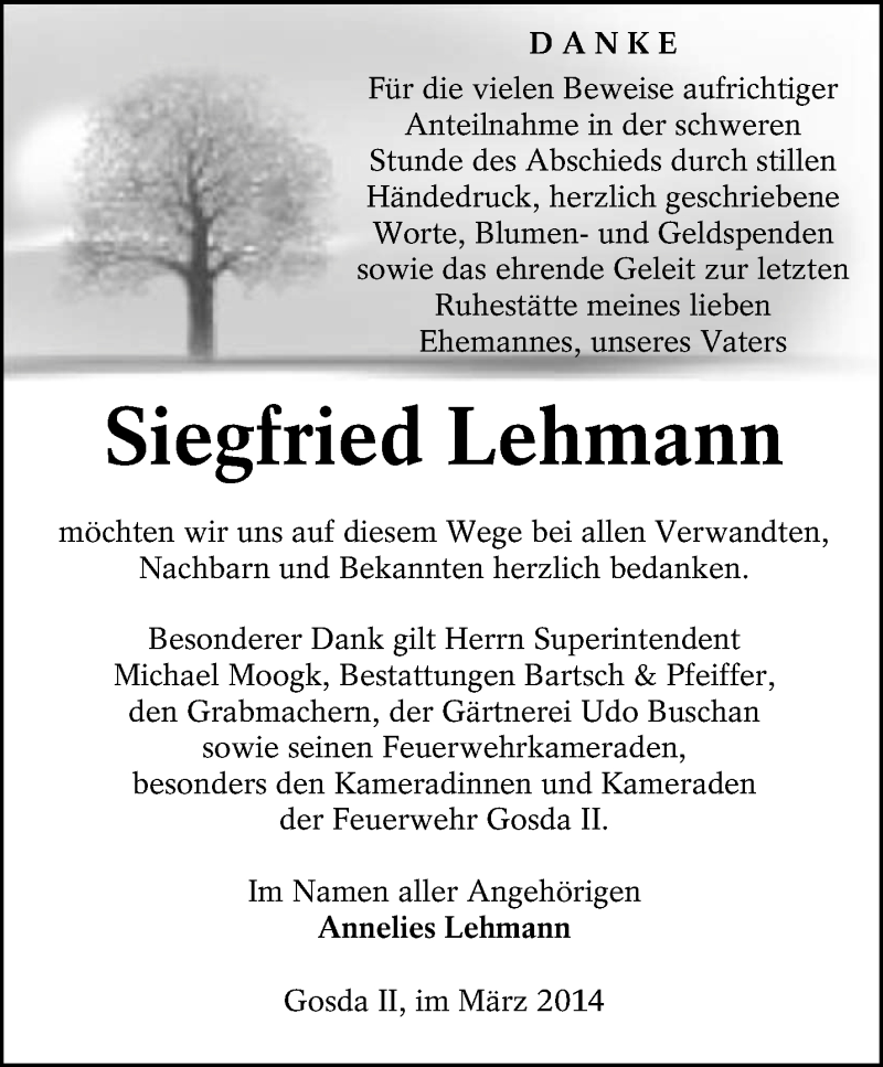 Hier finden Sie alle Traueranzeigen aus der Zeitung, die bisher für Siegfried Lehmann erschienen sind. Weitere Traueranzeigen, die in der Zeitung erscheinen, werden hier ebenfalls aufgelistet