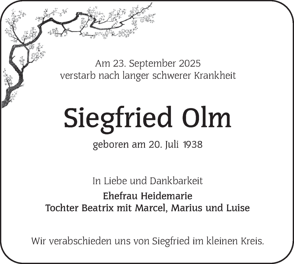 Hier finden Sie alle Traueranzeigen aus der Zeitung, die bisher für Siegfried Olm erschienen sind. Weitere Traueranzeigen, die in der Zeitung erscheinen, werden hier ebenfalls aufgelistet