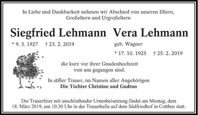 Hier finden Sie alle Traueranzeigen aus der Zeitung, die bisher für Siegfried und Vera Lehmann erschienen sind. Weitere Traueranzeigen, die in der Zeitung erscheinen, werden hier ebenfalls aufgelistet