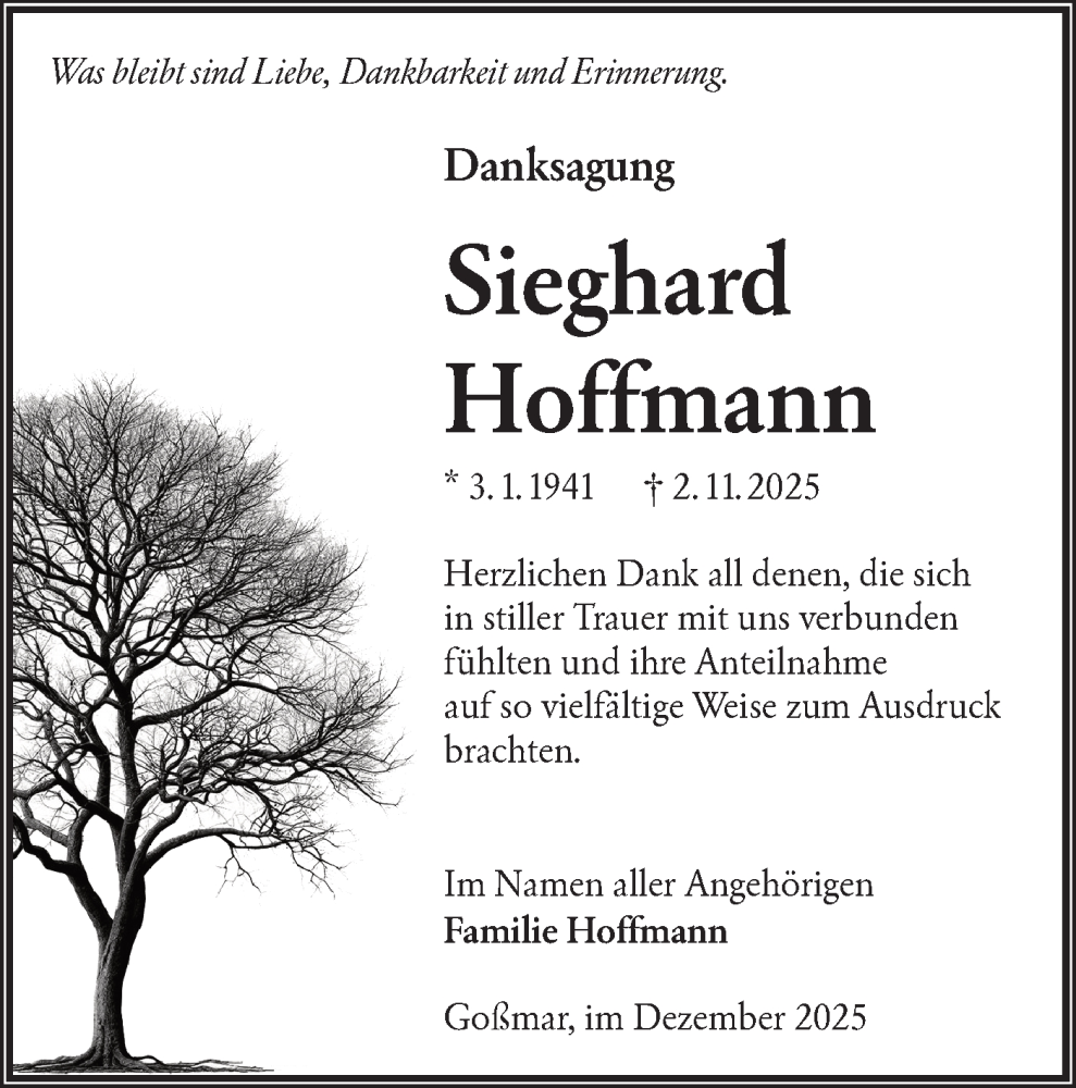 Hier finden Sie alle Traueranzeigen aus der Zeitung, die bisher für Sieghard Hoffmann erschienen sind. Weitere Traueranzeigen, die in der Zeitung erscheinen, werden hier ebenfalls aufgelistet