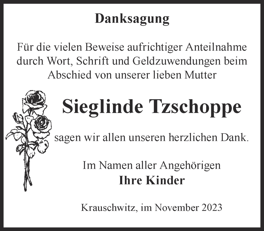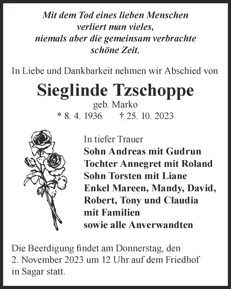 Hier finden Sie alle Traueranzeigen aus der Zeitung, die bisher für Sieglinde Tzschoppe erschienen sind. Weitere Traueranzeigen, die in der Zeitung erscheinen, werden hier ebenfalls aufgelistet