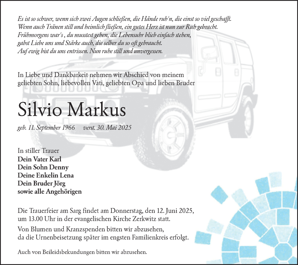 Hier finden Sie alle Traueranzeigen aus der Zeitung, die bisher für Silvio Markus erschienen sind. Weitere Traueranzeigen, die in der Zeitung erscheinen, werden hier ebenfalls aufgelistet