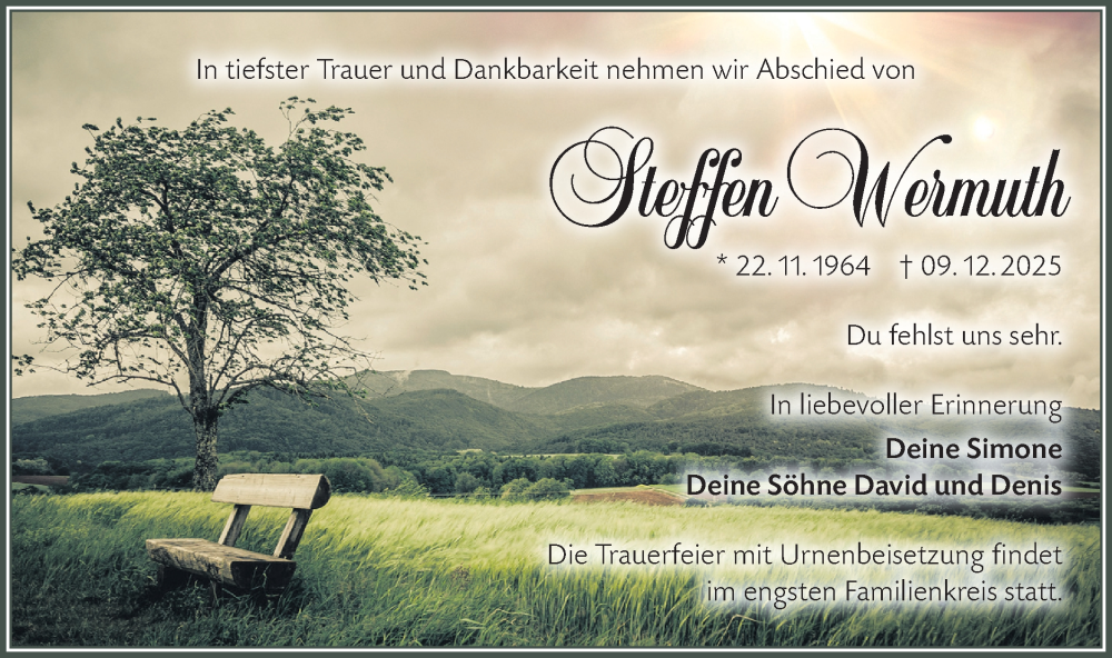 Hier finden Sie alle Traueranzeigen aus der Zeitung, die bisher für Steffen Wermuth erschienen sind. Weitere Traueranzeigen, die in der Zeitung erscheinen, werden hier ebenfalls aufgelistet