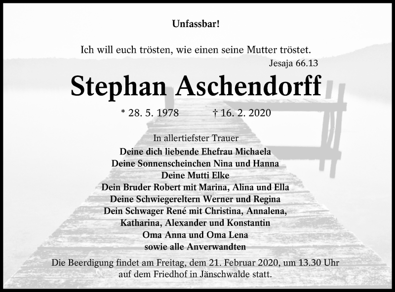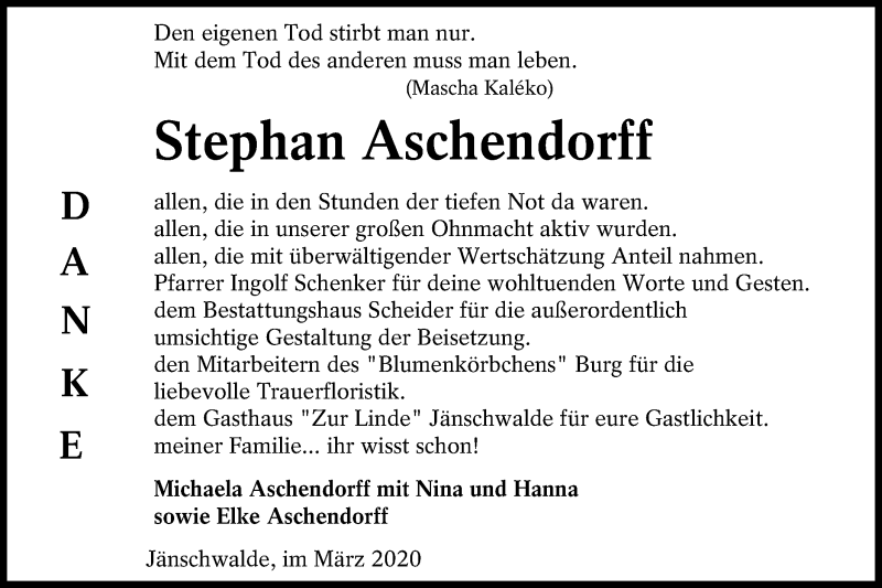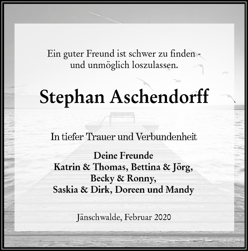 Hier finden Sie alle Traueranzeigen aus der Zeitung, die bisher für Stephan Aschendorff erschienen sind. Weitere Traueranzeigen, die in der Zeitung erscheinen, werden hier ebenfalls aufgelistet