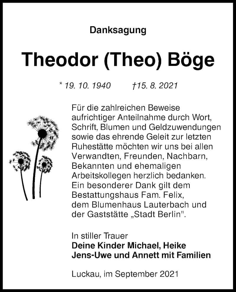 Hier finden Sie alle Traueranzeigen aus der Zeitung, die bisher für Theodor Böge erschienen sind. Weitere Traueranzeigen, die in der Zeitung erscheinen, werden hier ebenfalls aufgelistet