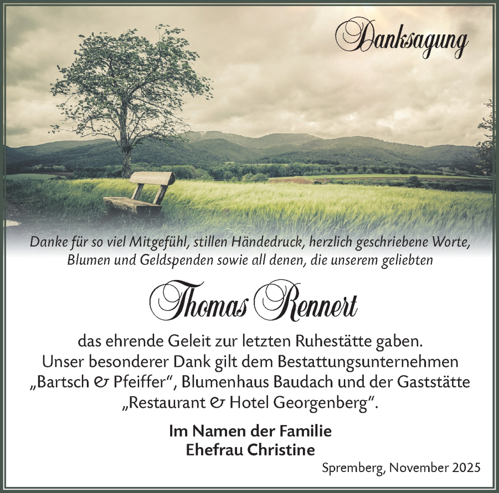 Hier finden Sie alle Traueranzeigen aus der Zeitung, die bisher für Thomas Rennert erschienen sind. Weitere Traueranzeigen, die in der Zeitung erscheinen, werden hier ebenfalls aufgelistet