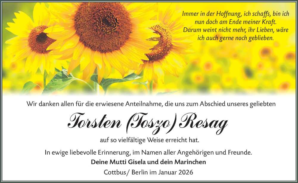 Hier finden Sie alle Traueranzeigen aus der Zeitung, die bisher für Torsten Resag erschienen sind. Weitere Traueranzeigen, die in der Zeitung erscheinen, werden hier ebenfalls aufgelistet