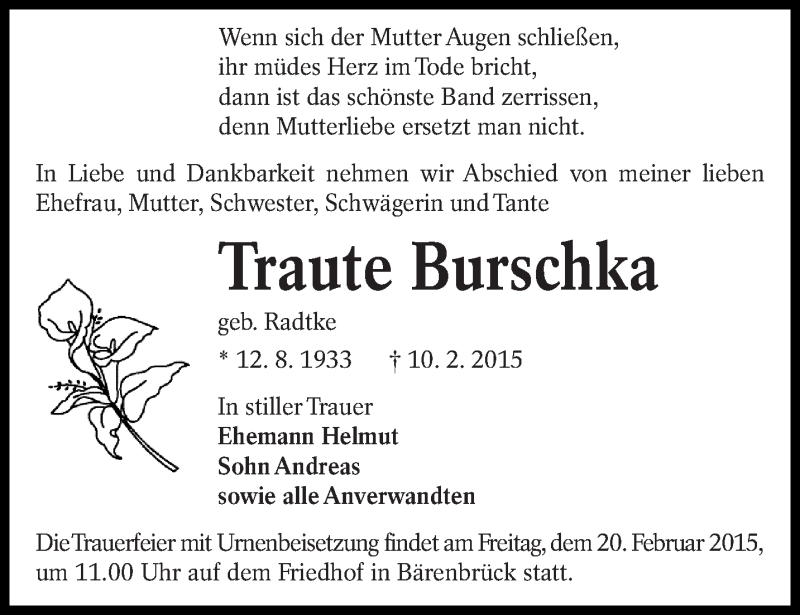 Hier finden Sie alle Traueranzeigen aus der Zeitung, die bisher für Traute Burschka erschienen sind. Weitere Traueranzeigen, die in der Zeitung erscheinen, werden hier ebenfalls aufgelistet