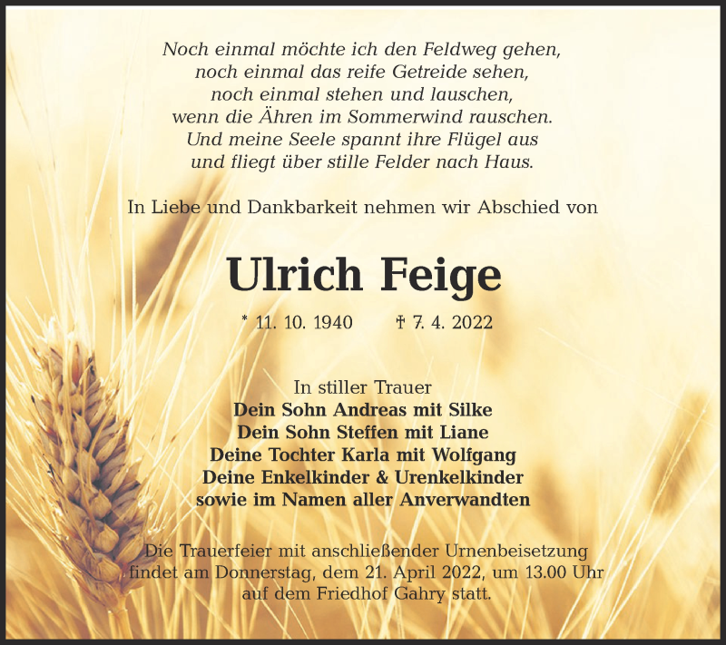 Hier finden Sie alle Traueranzeigen aus der Zeitung, die bisher für Ulrich Feige erschienen sind. Weitere Traueranzeigen, die in der Zeitung erscheinen, werden hier ebenfalls aufgelistet