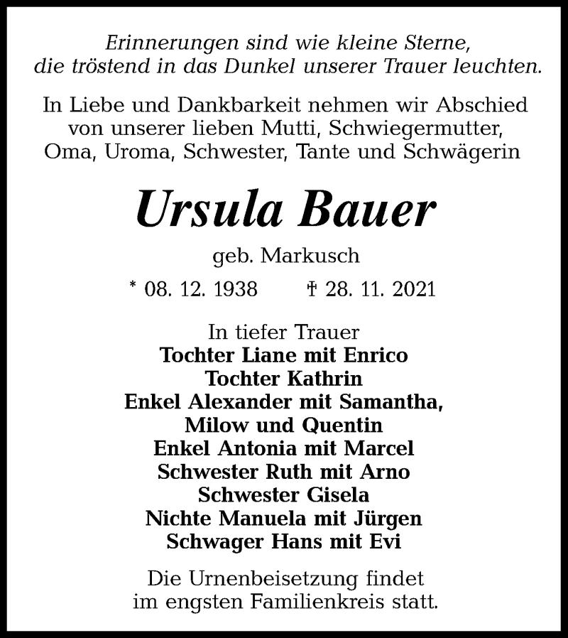 Hier finden Sie alle Traueranzeigen aus der Zeitung, die bisher für Ursula Bauer erschienen sind. Weitere Traueranzeigen, die in der Zeitung erscheinen, werden hier ebenfalls aufgelistet