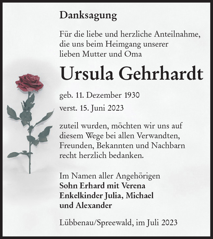 Hier finden Sie alle Traueranzeigen aus der Zeitung, die bisher für Ursula Gehrhardt erschienen sind. Weitere Traueranzeigen, die in der Zeitung erscheinen, werden hier ebenfalls aufgelistet