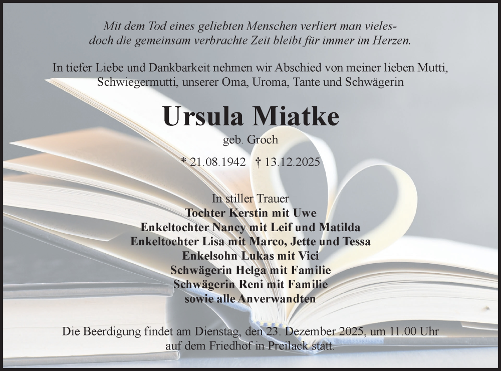 Hier finden Sie alle Traueranzeigen aus der Zeitung, die bisher für Ursula Miatke erschienen sind. Weitere Traueranzeigen, die in der Zeitung erscheinen, werden hier ebenfalls aufgelistet