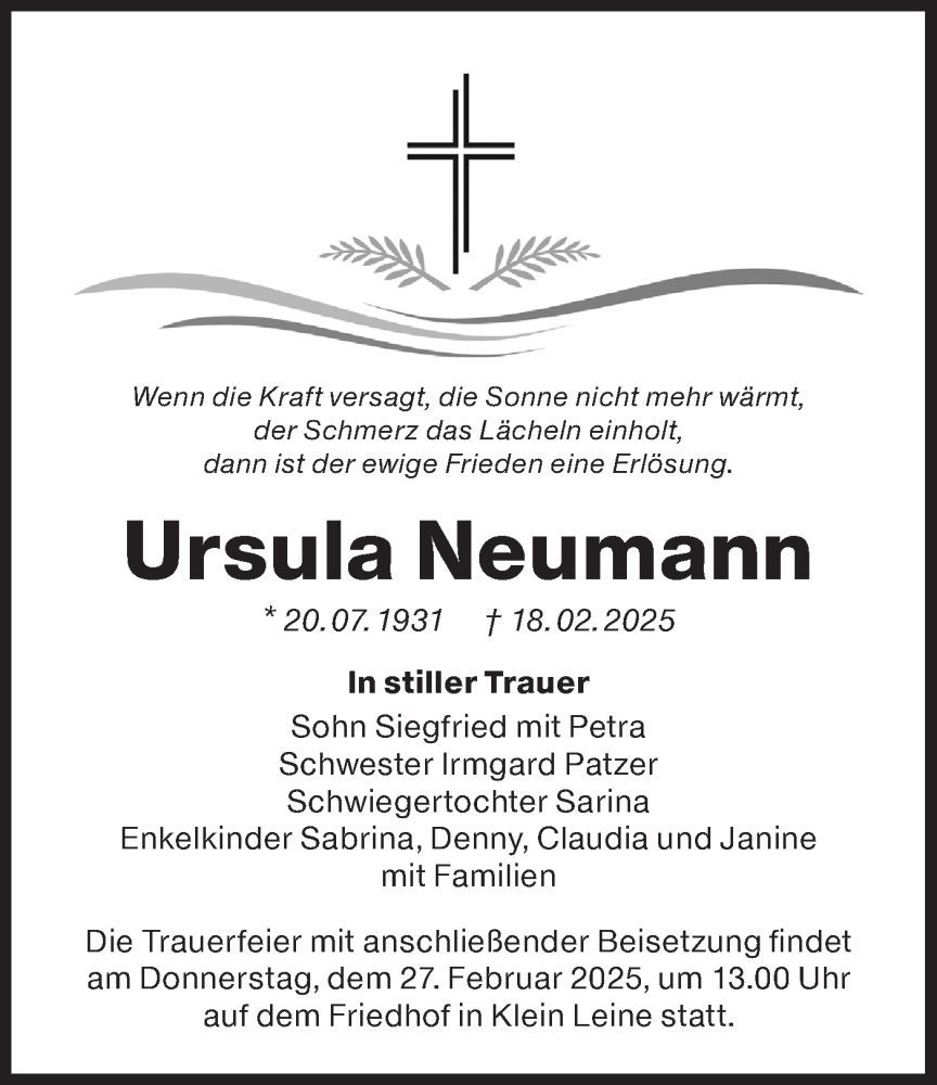 Hier finden Sie alle Traueranzeigen aus der Zeitung, die bisher für Ursula Neumann erschienen sind. Weitere Traueranzeigen, die in der Zeitung erscheinen, werden hier ebenfalls aufgelistet