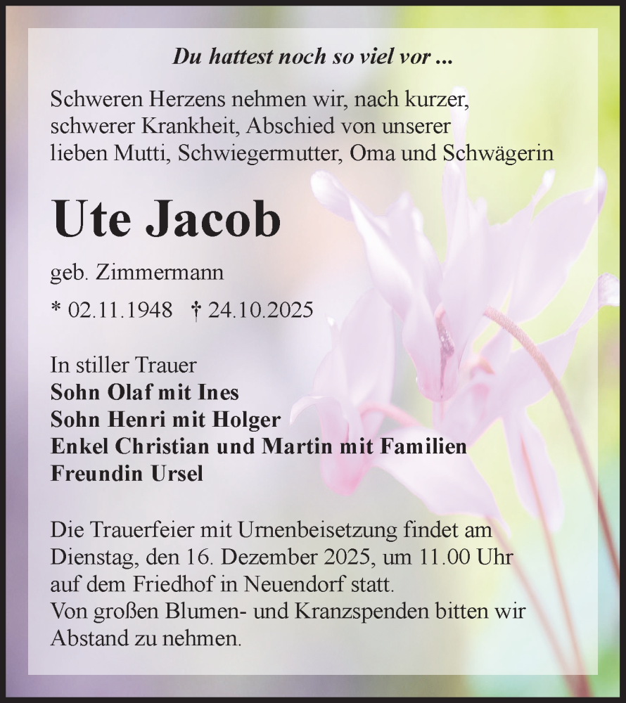 Hier finden Sie alle Traueranzeigen aus der Zeitung, die bisher für Ute Jacob erschienen sind. Weitere Traueranzeigen, die in der Zeitung erscheinen, werden hier ebenfalls aufgelistet