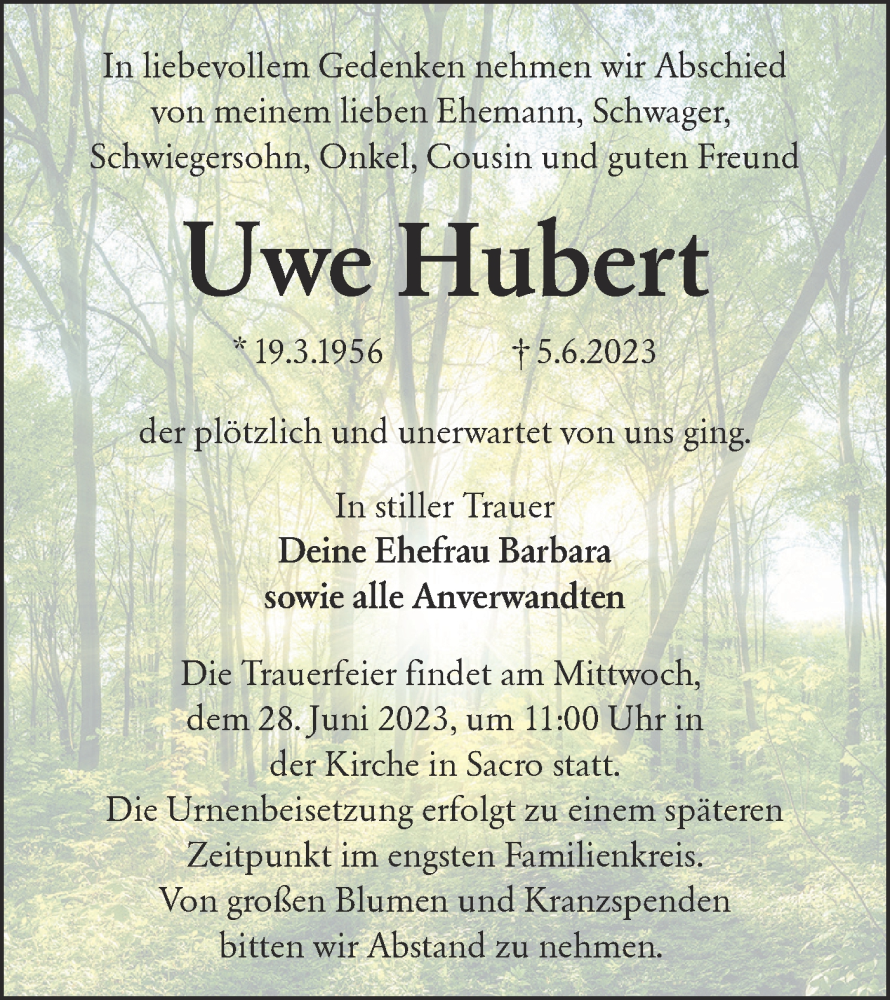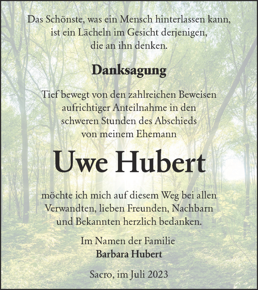 Hier finden Sie alle Traueranzeigen aus der Zeitung, die bisher für Uwe Hubert erschienen sind. Weitere Traueranzeigen, die in der Zeitung erscheinen, werden hier ebenfalls aufgelistet