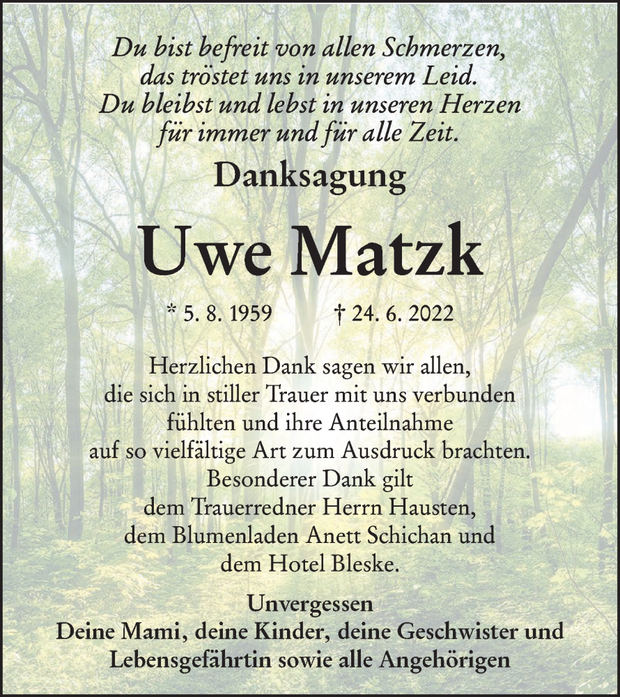 Hier finden Sie alle Traueranzeigen aus der Zeitung, die bisher für Uwe Matzk erschienen sind. Weitere Traueranzeigen, die in der Zeitung erscheinen, werden hier ebenfalls aufgelistet
