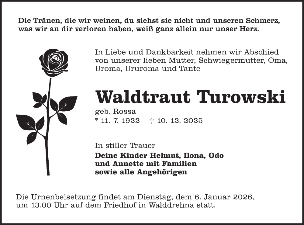 Hier finden Sie alle Traueranzeigen aus der Zeitung, die bisher für Waldtraut Turowski erschienen sind. Weitere Traueranzeigen, die in der Zeitung erscheinen, werden hier ebenfalls aufgelistet