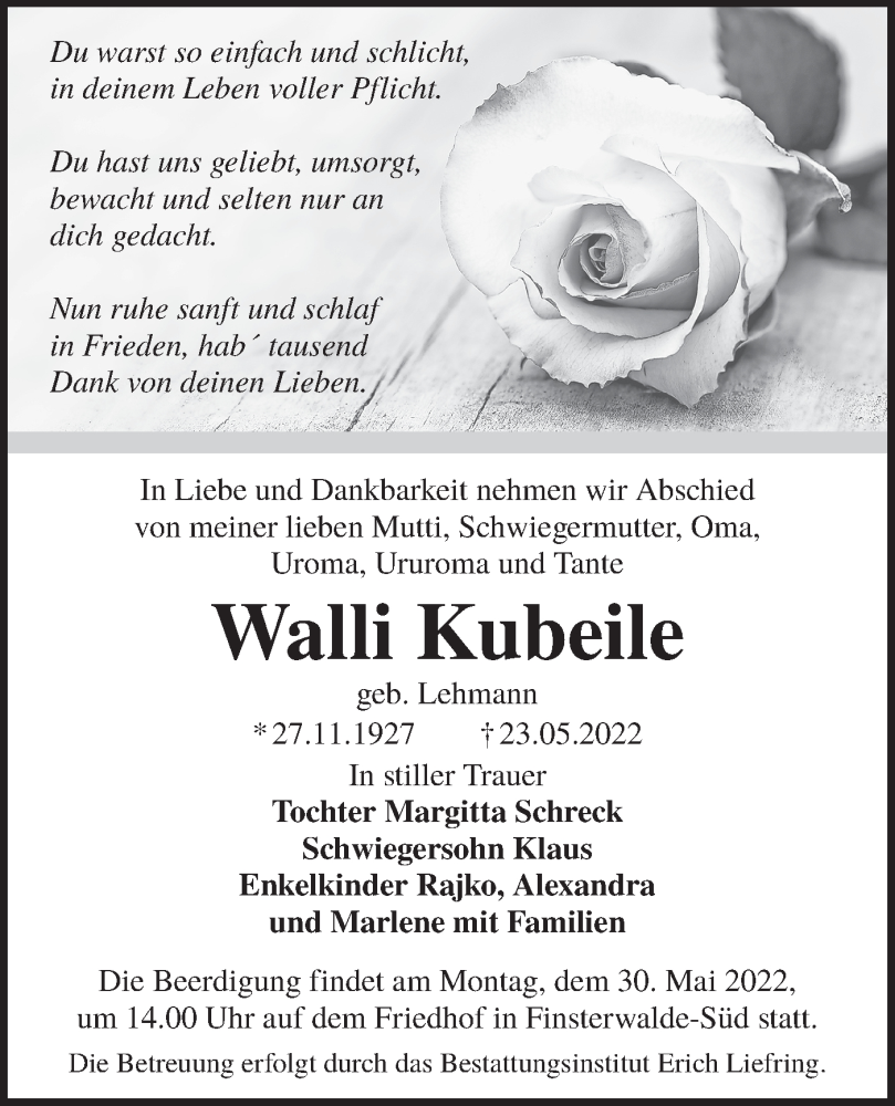 Hier finden Sie alle Traueranzeigen aus der Zeitung, die bisher für Walli Kubeile erschienen sind. Weitere Traueranzeigen, die in der Zeitung erscheinen, werden hier ebenfalls aufgelistet
