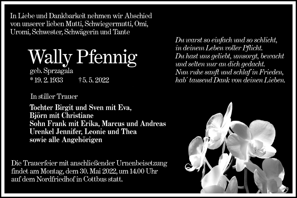 Hier finden Sie alle Traueranzeigen aus der Zeitung, die bisher für Wally Pfennig erschienen sind. Weitere Traueranzeigen, die in der Zeitung erscheinen, werden hier ebenfalls aufgelistet