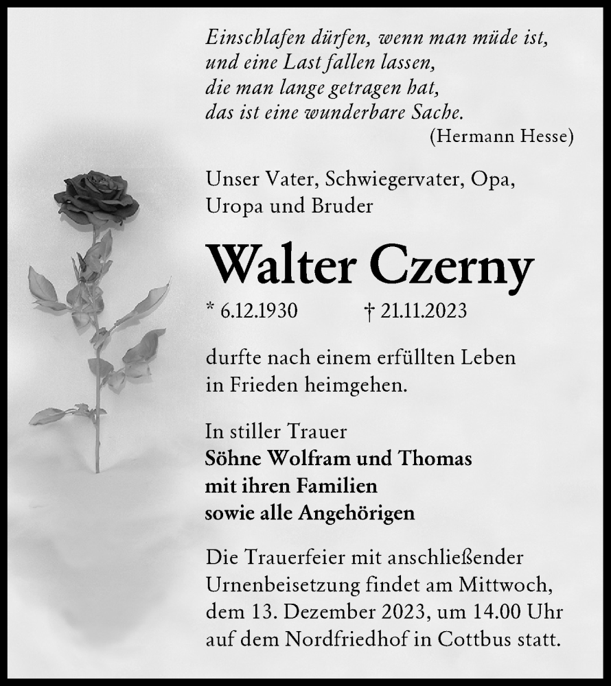 Hier finden Sie alle Traueranzeigen aus der Zeitung, die bisher für Walter Czerny erschienen sind. Weitere Traueranzeigen, die in der Zeitung erscheinen, werden hier ebenfalls aufgelistet