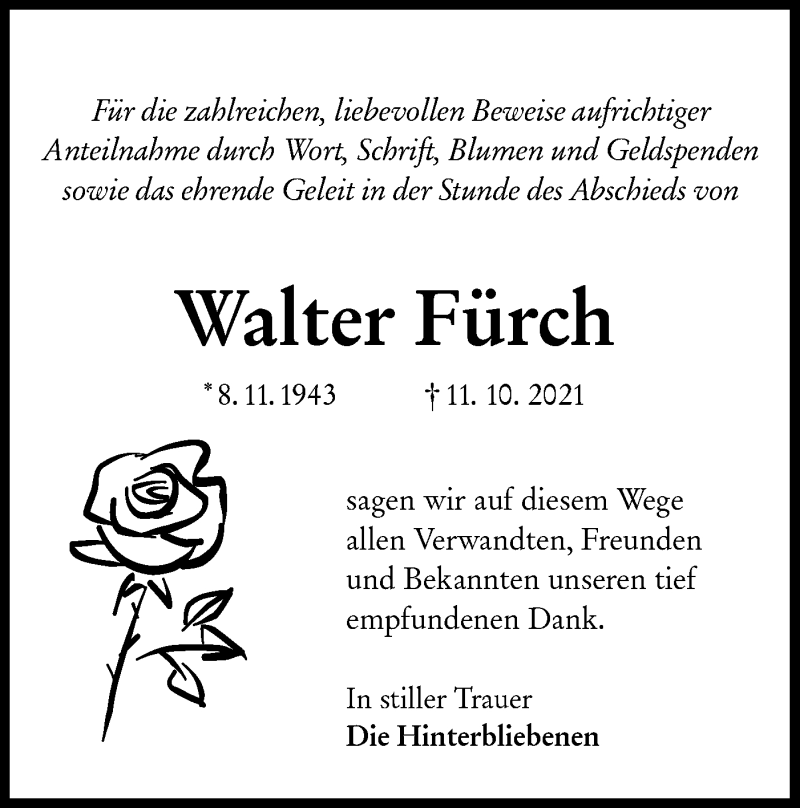 Hier finden Sie alle Traueranzeigen aus der Zeitung, die bisher für Walter Fürch erschienen sind. Weitere Traueranzeigen, die in der Zeitung erscheinen, werden hier ebenfalls aufgelistet
