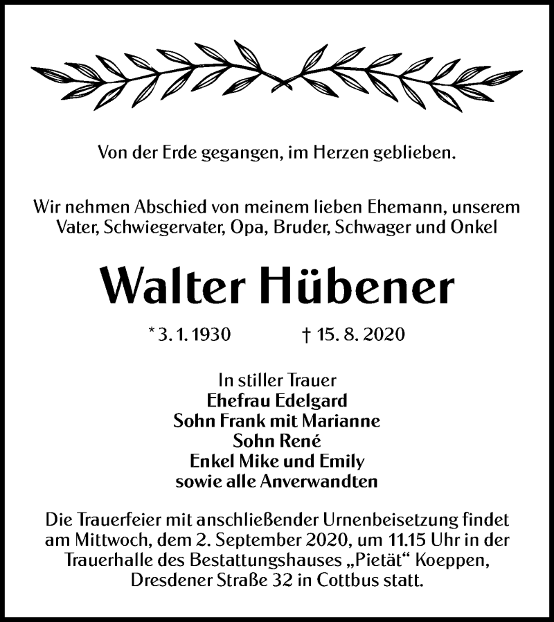 Hier finden Sie alle Traueranzeigen aus der Zeitung, die bisher für Walter Hübener erschienen sind. Weitere Traueranzeigen, die in der Zeitung erscheinen, werden hier ebenfalls aufgelistet