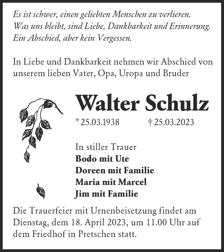 Hier finden Sie alle Traueranzeigen aus der Zeitung, die bisher für Walter Schulz erschienen sind. Weitere Traueranzeigen, die in der Zeitung erscheinen, werden hier ebenfalls aufgelistet
