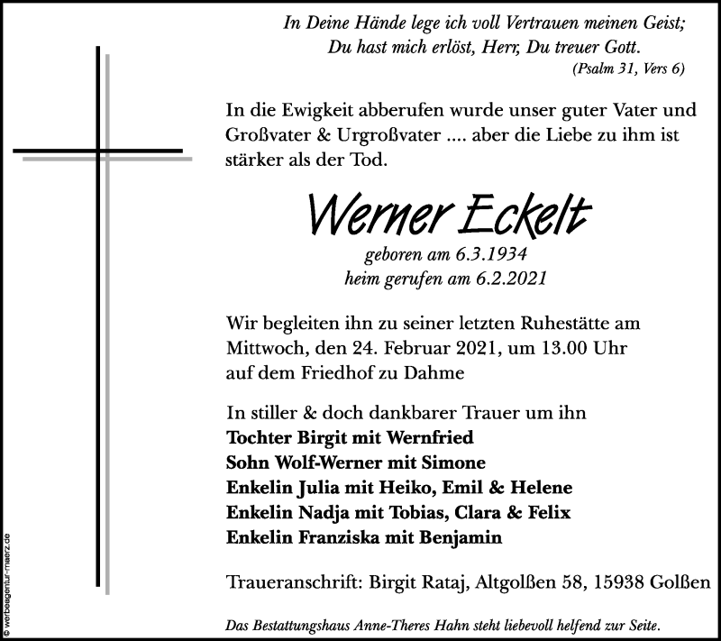 Hier finden Sie alle Traueranzeigen aus der Zeitung, die bisher für Werner Eckelt erschienen sind. Weitere Traueranzeigen, die in der Zeitung erscheinen, werden hier ebenfalls aufgelistet