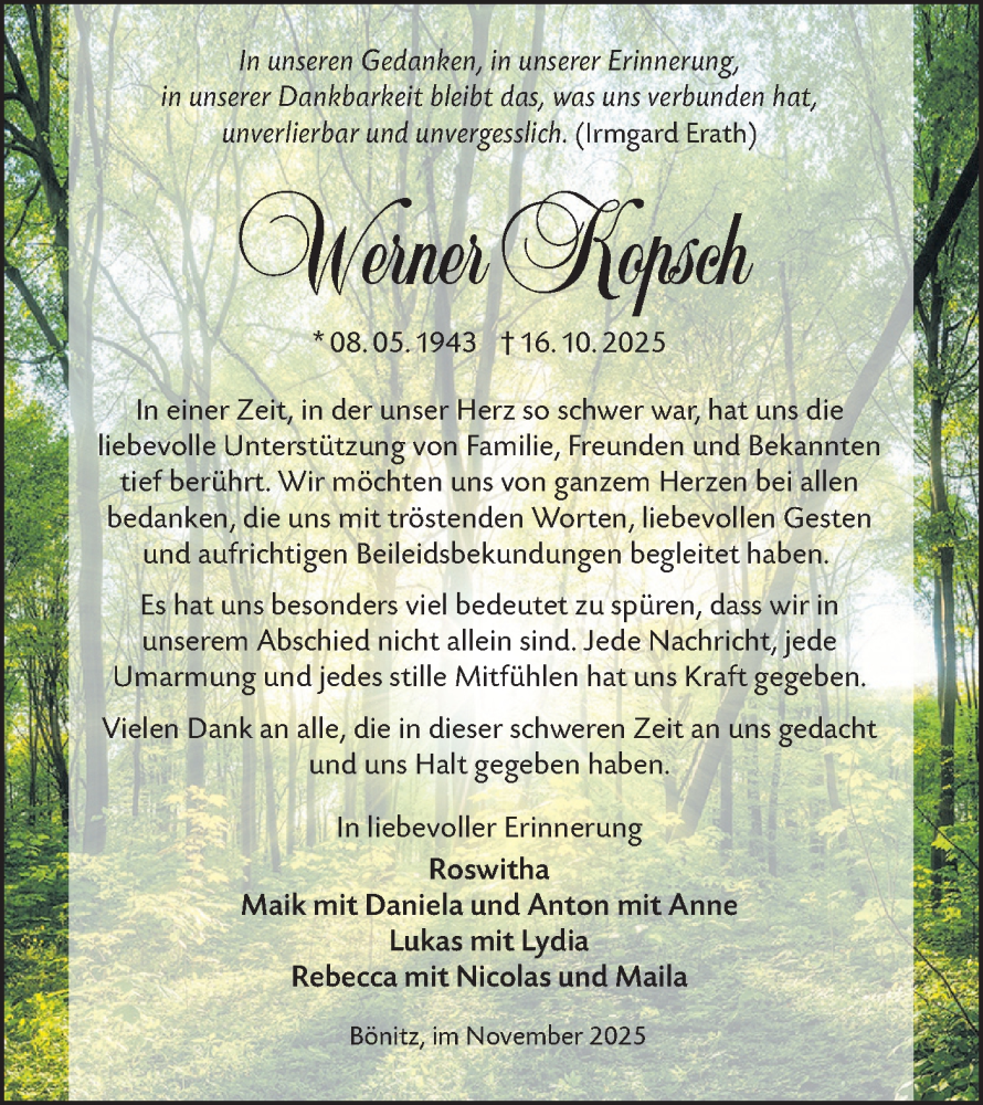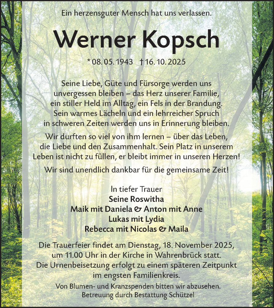 Hier finden Sie alle Traueranzeigen aus der Zeitung, die bisher für Werner Kopsch erschienen sind. Weitere Traueranzeigen, die in der Zeitung erscheinen, werden hier ebenfalls aufgelistet