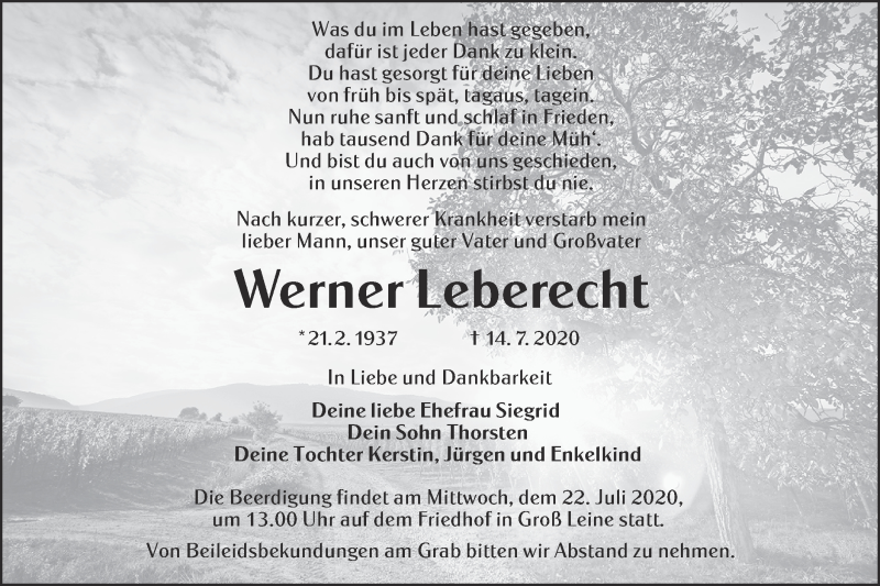 Hier finden Sie alle Traueranzeigen aus der Zeitung, die bisher für Werner Leberecht erschienen sind. Weitere Traueranzeigen, die in der Zeitung erscheinen, werden hier ebenfalls aufgelistet