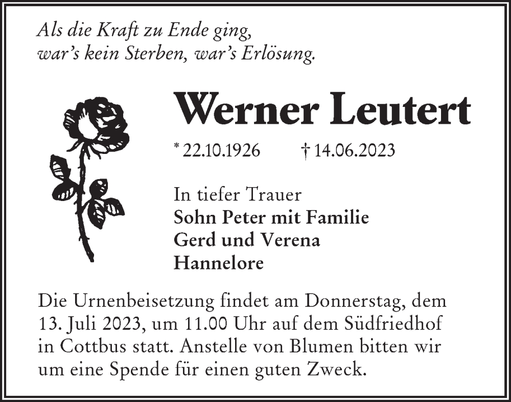 Hier finden Sie alle Traueranzeigen aus der Zeitung, die bisher für Werner Leutert erschienen sind. Weitere Traueranzeigen, die in der Zeitung erscheinen, werden hier ebenfalls aufgelistet