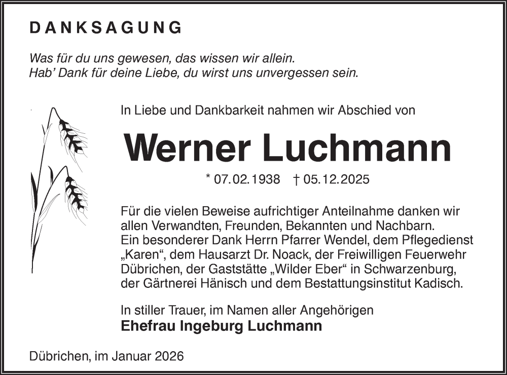 Hier finden Sie alle Traueranzeigen aus der Zeitung, die bisher für Werner Luchmann erschienen sind. Weitere Traueranzeigen, die in der Zeitung erscheinen, werden hier ebenfalls aufgelistet