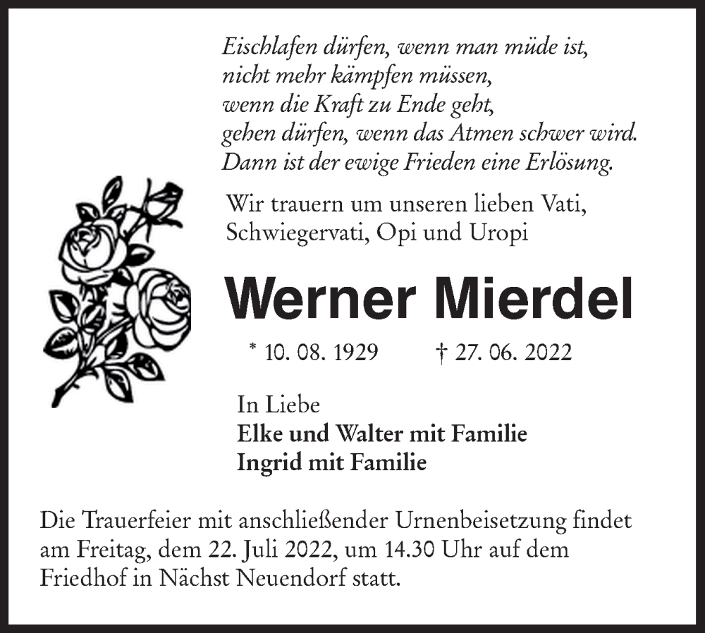 Hier finden Sie alle Traueranzeigen aus der Zeitung, die bisher für Werner Mierdel erschienen sind. Weitere Traueranzeigen, die in der Zeitung erscheinen, werden hier ebenfalls aufgelistet