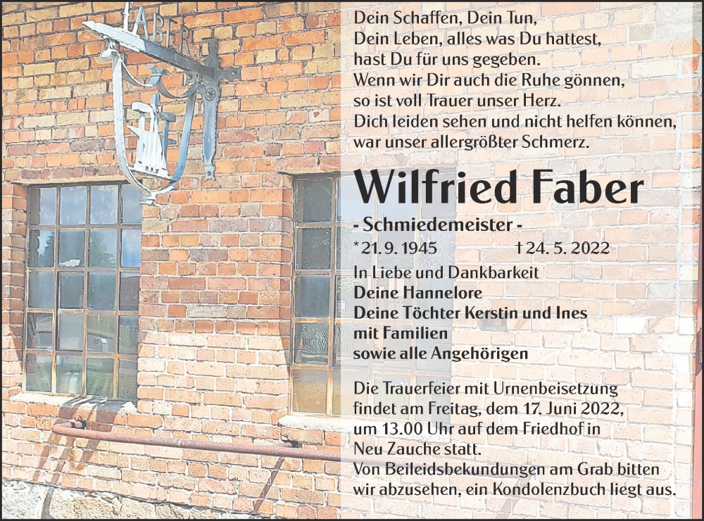 Hier finden Sie alle Traueranzeigen aus der Zeitung, die bisher für Wilfried Faber erschienen sind. Weitere Traueranzeigen, die in der Zeitung erscheinen, werden hier ebenfalls aufgelistet