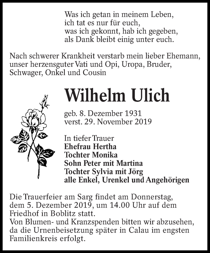 Hier finden Sie alle Traueranzeigen aus der Zeitung, die bisher für Wilhelm Ulich erschienen sind. Weitere Traueranzeigen, die in der Zeitung erscheinen, werden hier ebenfalls aufgelistet