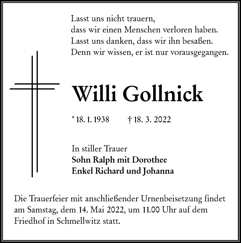 Hier finden Sie alle Traueranzeigen aus der Zeitung, die bisher für Willi Gollnick erschienen sind. Weitere Traueranzeigen, die in der Zeitung erscheinen, werden hier ebenfalls aufgelistet