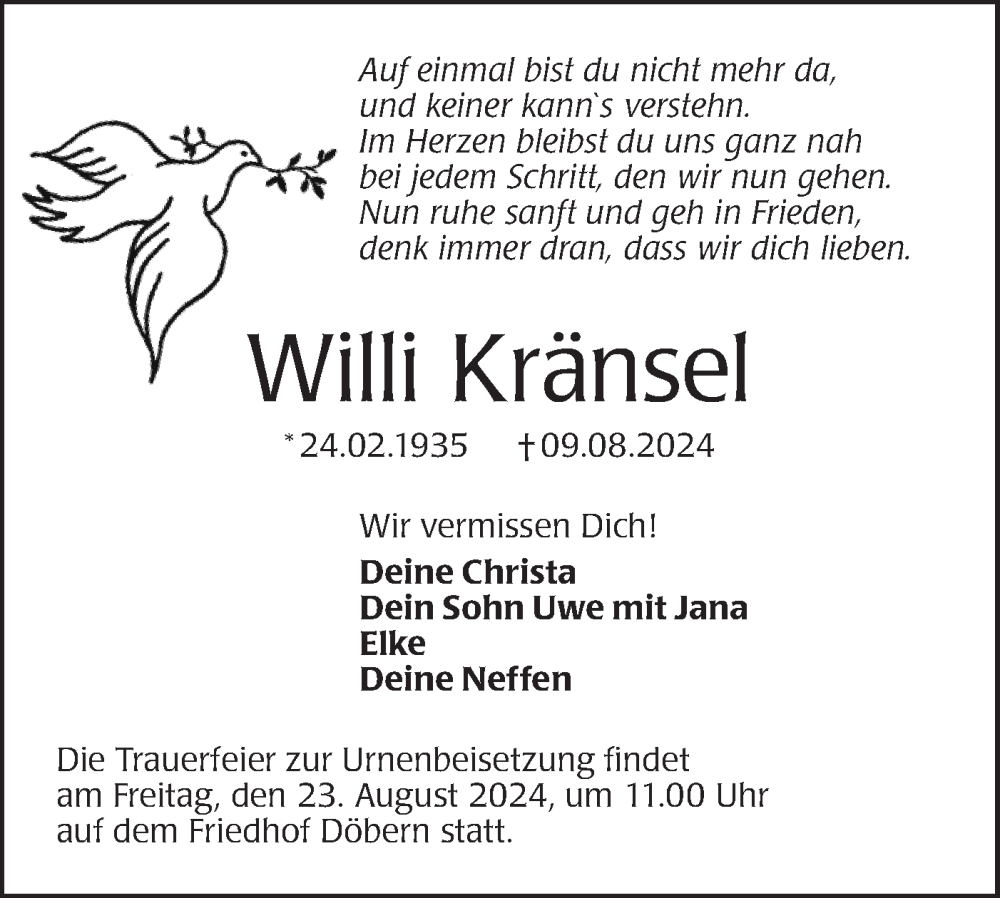 Hier finden Sie alle Traueranzeigen aus der Zeitung, die bisher für Willi Kränsel erschienen sind. Weitere Traueranzeigen, die in der Zeitung erscheinen, werden hier ebenfalls aufgelistet