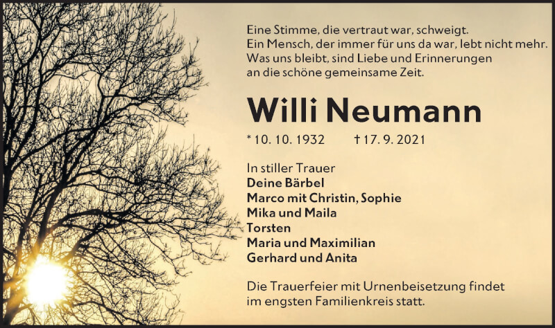 Hier finden Sie alle Traueranzeigen aus der Zeitung, die bisher für Willi Neumann erschienen sind. Weitere Traueranzeigen, die in der Zeitung erscheinen, werden hier ebenfalls aufgelistet