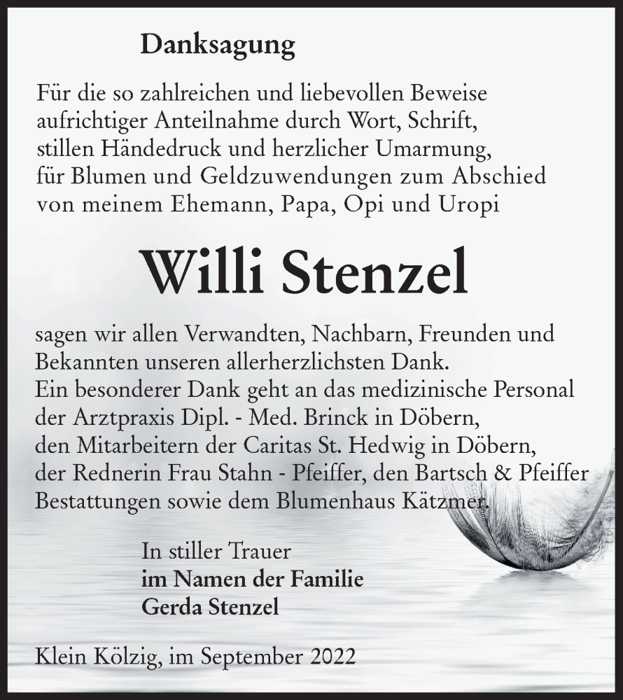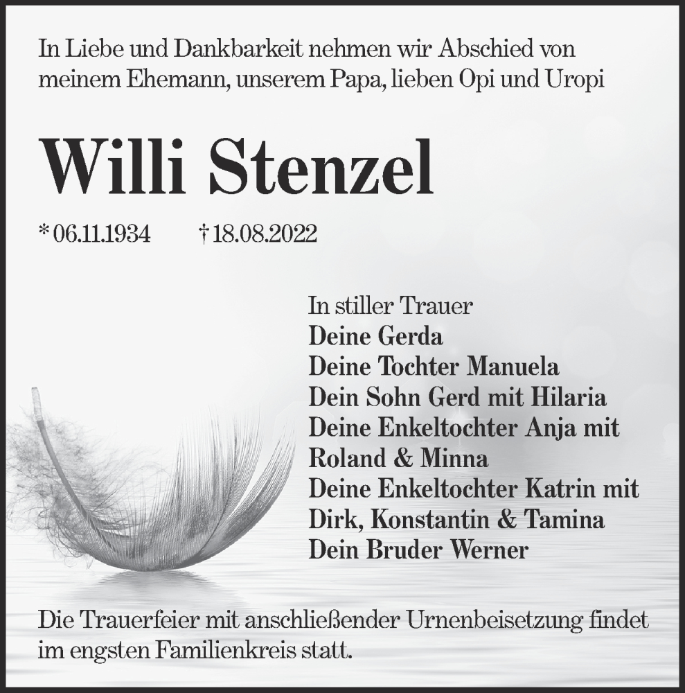 Hier finden Sie alle Traueranzeigen aus der Zeitung, die bisher für Willi Stenzel erschienen sind. Weitere Traueranzeigen, die in der Zeitung erscheinen, werden hier ebenfalls aufgelistet