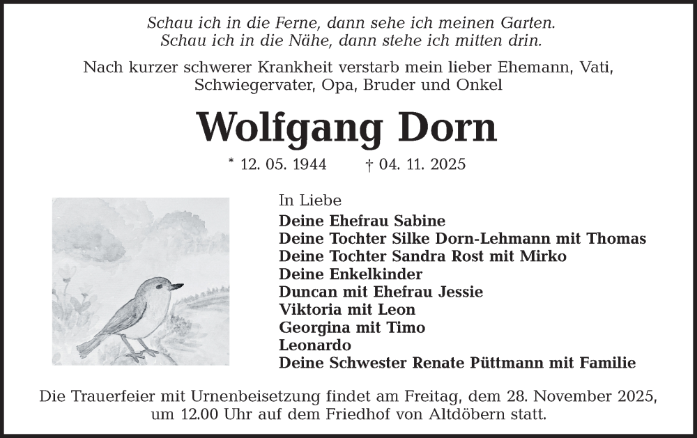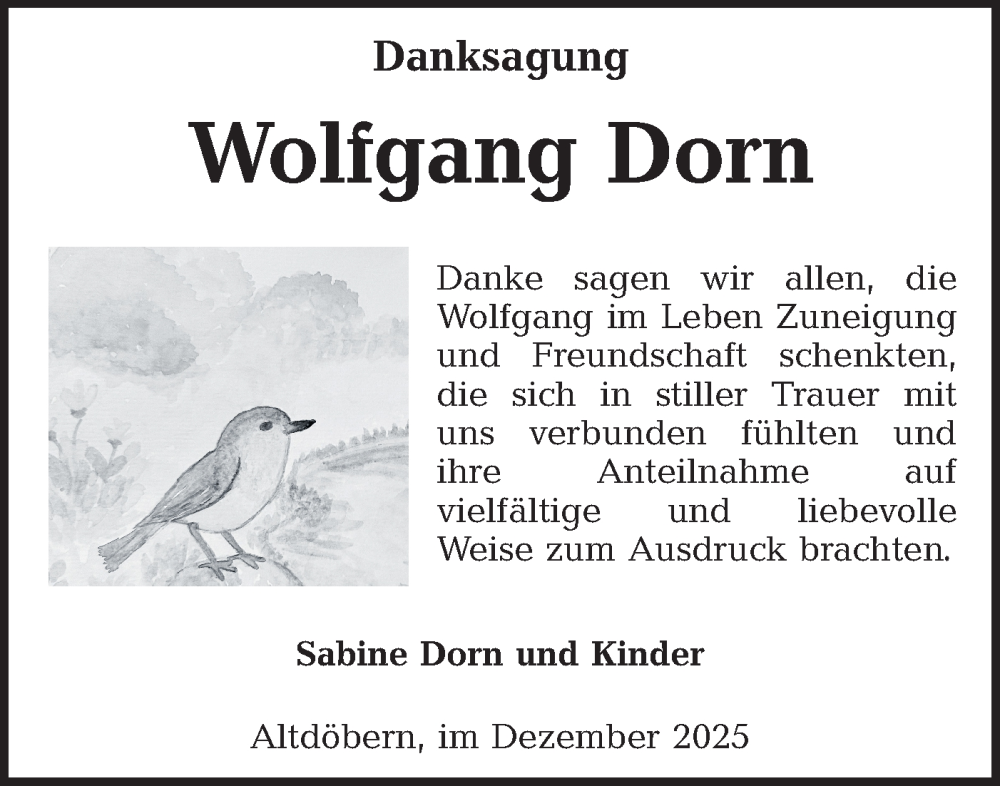 Hier finden Sie alle Traueranzeigen aus der Zeitung, die bisher für Wolfgang Dorn erschienen sind. Weitere Traueranzeigen, die in der Zeitung erscheinen, werden hier ebenfalls aufgelistet