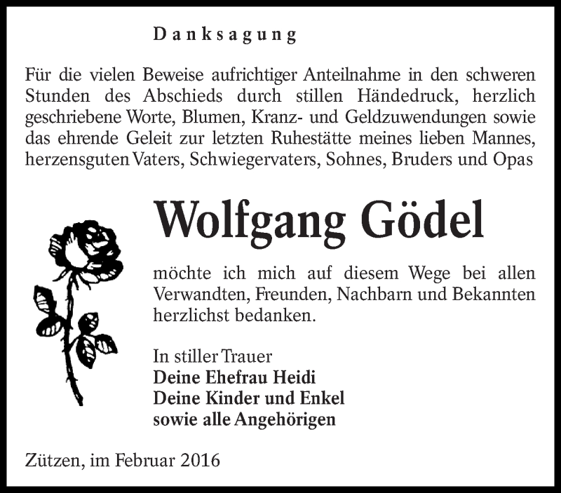 Hier finden Sie alle Traueranzeigen aus der Zeitung, die bisher für Wolfgang Gödel erschienen sind. Weitere Traueranzeigen, die in der Zeitung erscheinen, werden hier ebenfalls aufgelistet