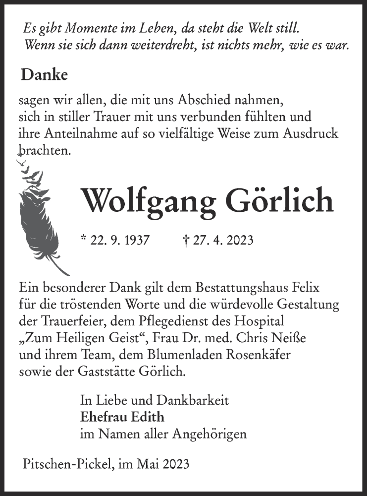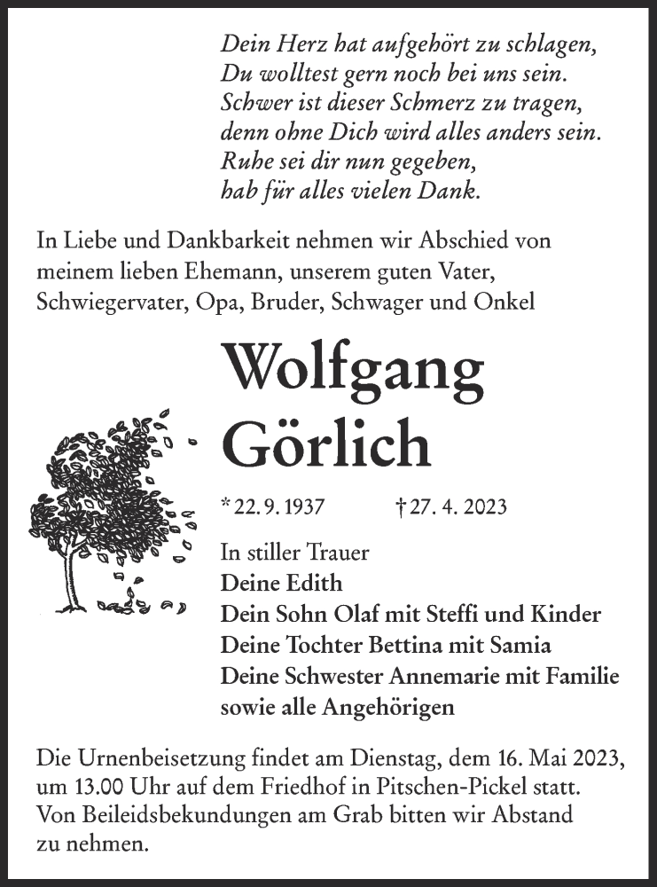 Hier finden Sie alle Traueranzeigen aus der Zeitung, die bisher für Wolfgang Görlich erschienen sind. Weitere Traueranzeigen, die in der Zeitung erscheinen, werden hier ebenfalls aufgelistet