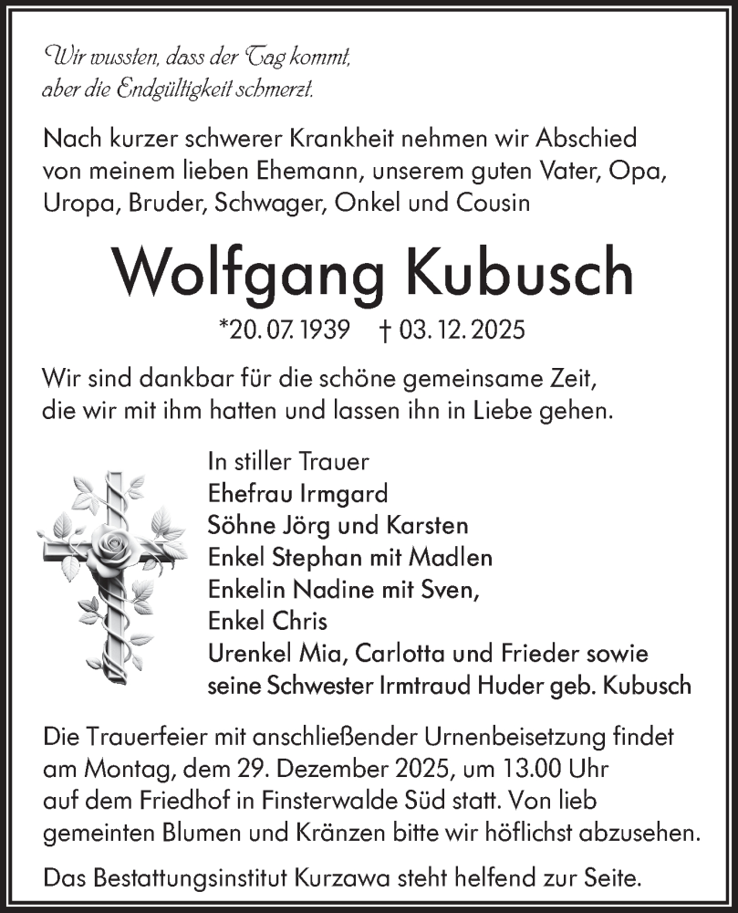 Hier finden Sie alle Traueranzeigen aus der Zeitung, die bisher für Wolfgang Kubusch erschienen sind. Weitere Traueranzeigen, die in der Zeitung erscheinen, werden hier ebenfalls aufgelistet