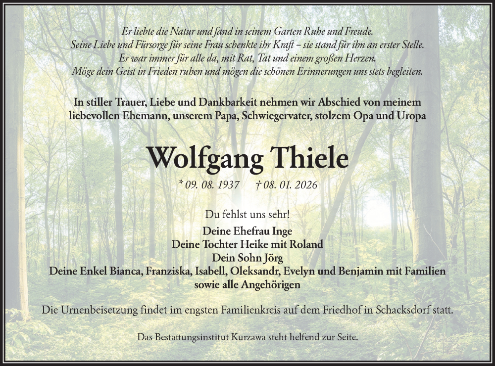 Hier finden Sie alle Traueranzeigen aus der Zeitung, die bisher für Wolfgang Thiele erschienen sind. Weitere Traueranzeigen, die in der Zeitung erscheinen, werden hier ebenfalls aufgelistet