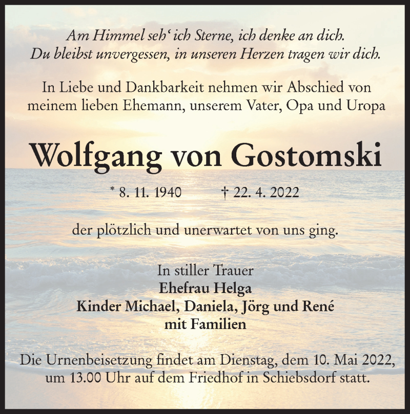 Hier finden Sie alle Traueranzeigen aus der Zeitung, die bisher für Wolfgang von Gostomski erschienen sind. Weitere Traueranzeigen, die in der Zeitung erscheinen, werden hier ebenfalls aufgelistet