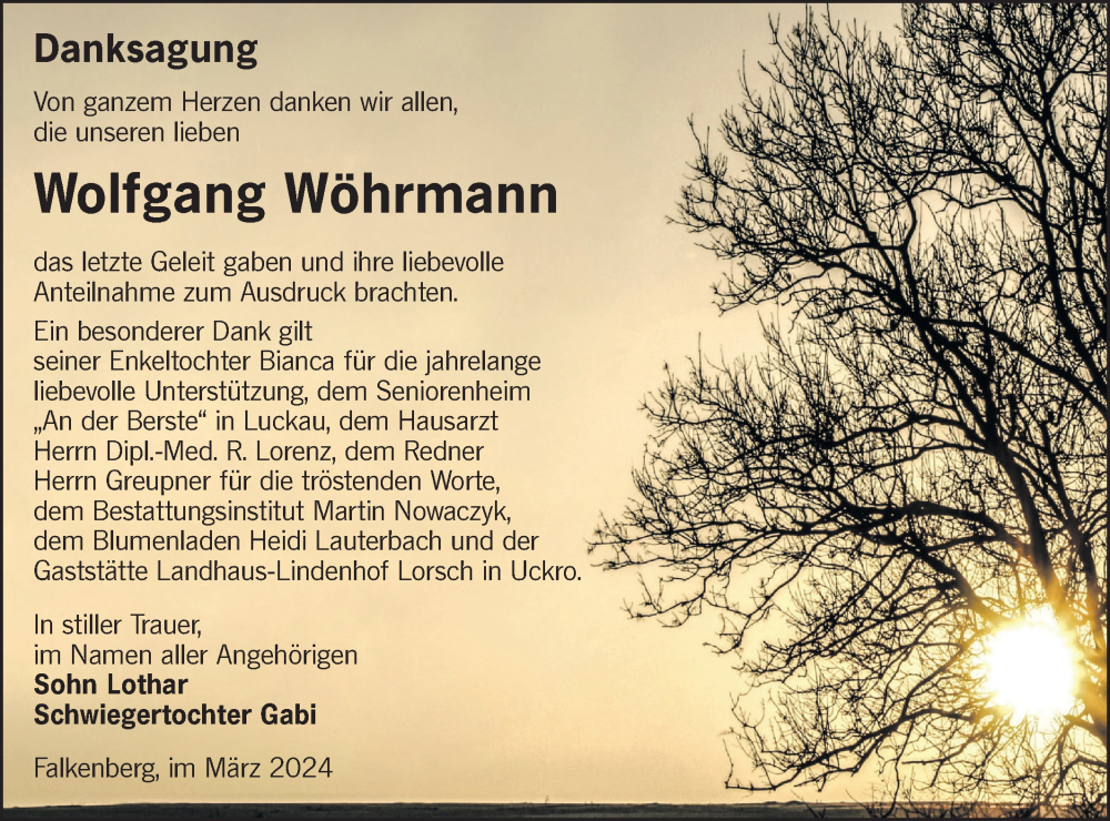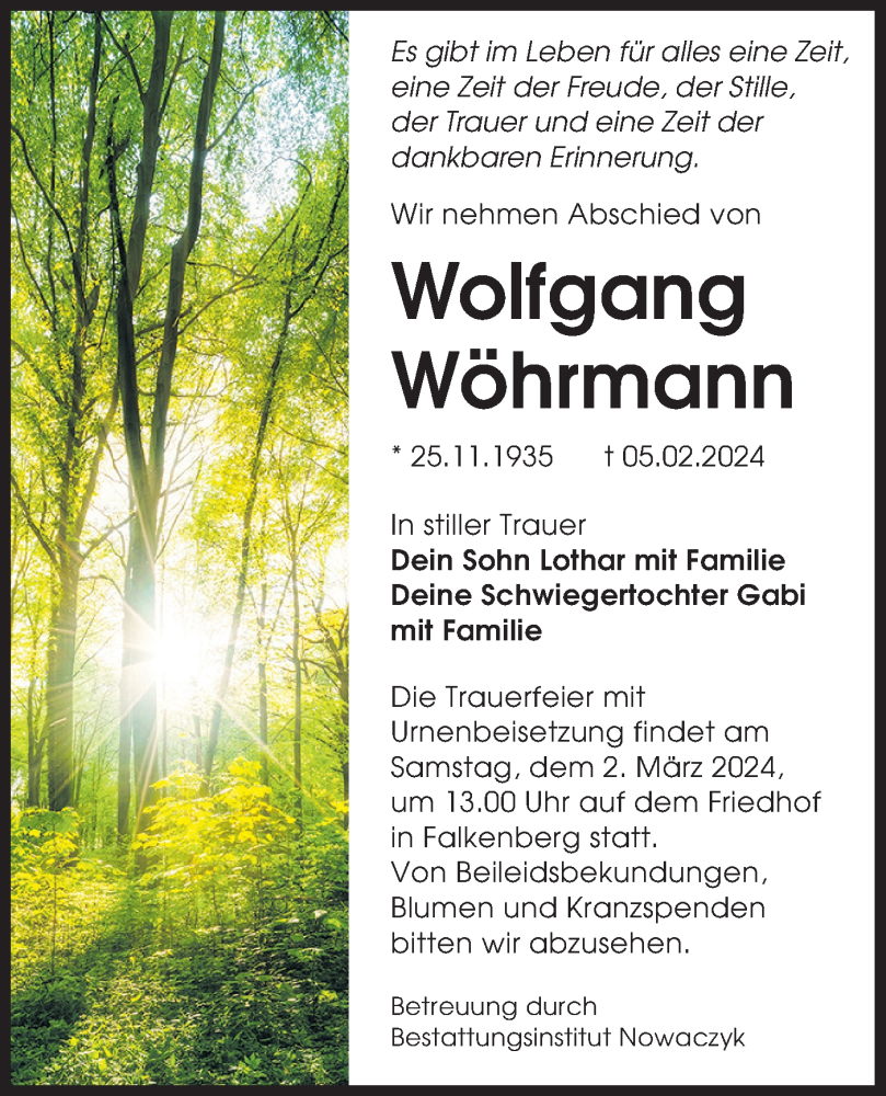 Hier finden Sie alle Traueranzeigen aus der Zeitung, die bisher für Wolfgang Wöhrmann erschienen sind. Weitere Traueranzeigen, die in der Zeitung erscheinen, werden hier ebenfalls aufgelistet