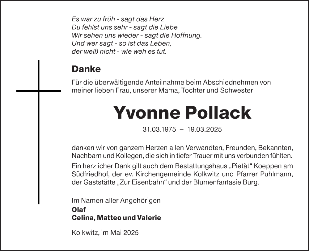 Hier finden Sie alle Traueranzeigen aus der Zeitung, die bisher für Yvonne Pollack erschienen sind. Weitere Traueranzeigen, die in der Zeitung erscheinen, werden hier ebenfalls aufgelistet